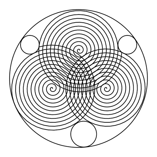 I've often been tempted to get a pen plotter, but haven't quite taken the plunge. For Genuary 22 I did some experiments with overlapping Archimedean spirals. I find them interesting since their radius is non-constant, so lining up the tangent circles becomes challenging. I still need to explore the Browne and van Wamelen paper on spiral packing - here they were just placed by brute-force.