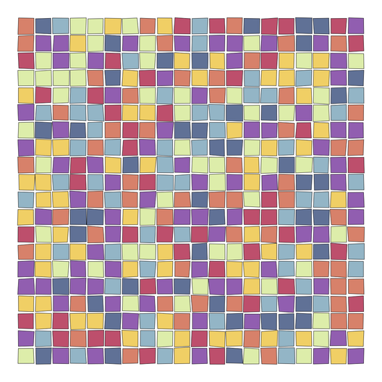 I explored several ideas for this one, where a regular grid has just a bit of randomness to make it slightly "off". The result reminds me of the tiles in my bathroom.